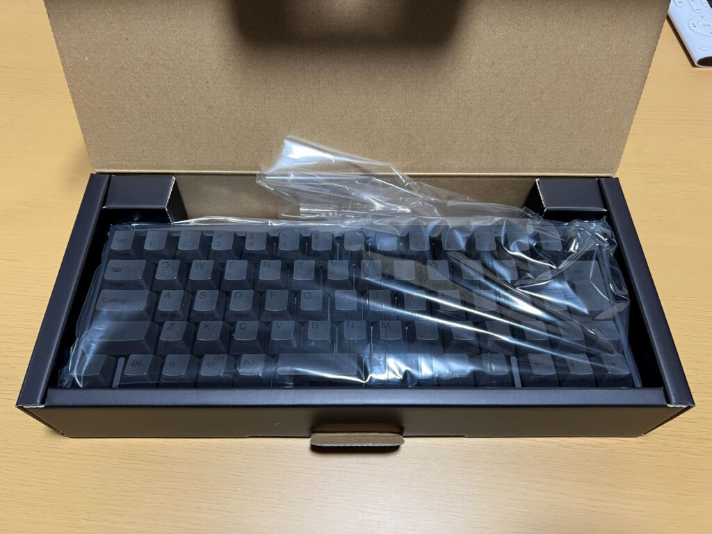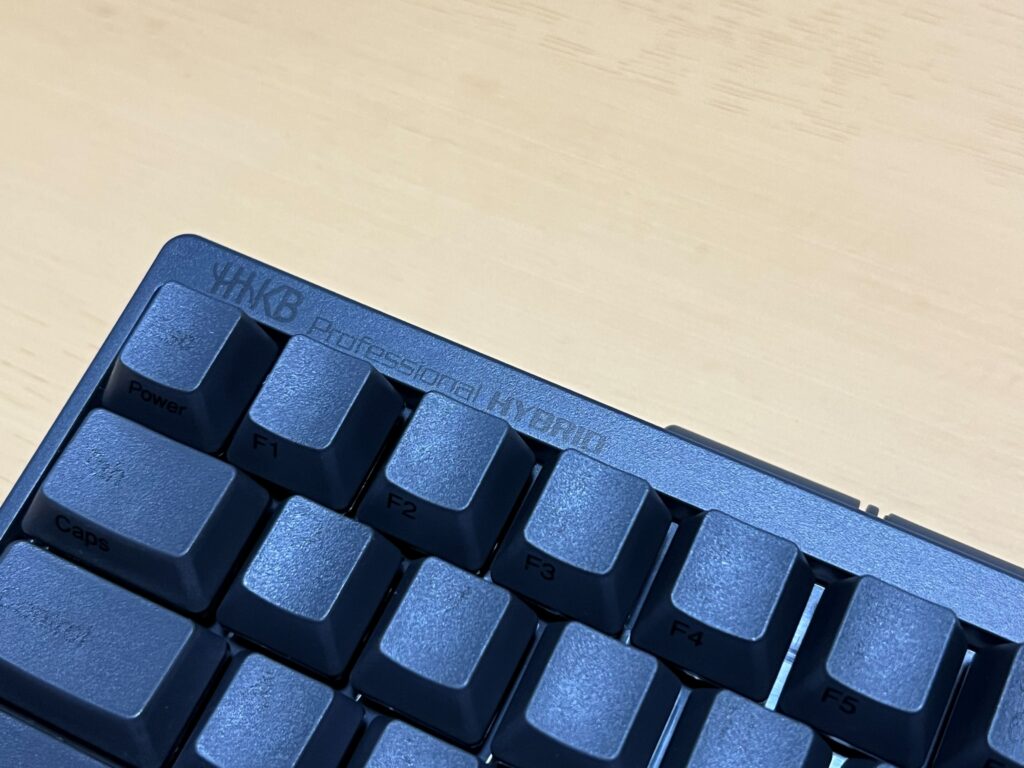 打鍵感とかいう前に見た目がとても良い。僕は墨という本体も刻印も黒のモデルを選択したが、正解。奇をてらって白にしなくてよかった。先述の通りファンクションキーの1列がないことでとてもコンパクト、それでいてシンプルなデザイン。