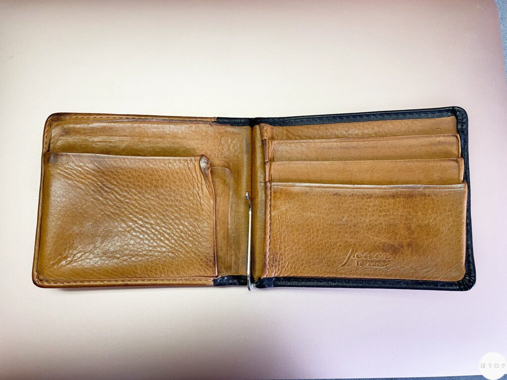 撮影時はすでに4年くらい使った状態のため黒ずんでいる部分がある。写真にある通り、小銭入れが大きく開くのが良い。Amazonで「小銭入れ付きマネークリップ」と検索するといくつかヒットするが、小銭入れがこんなに大きく開くタイプのものはあまりなかった。チェックタイプのものがいくつかあったが、論外。