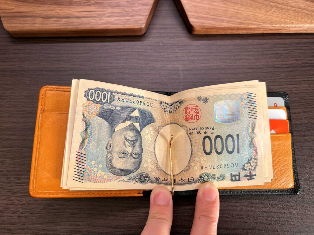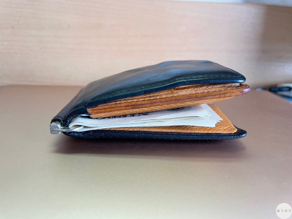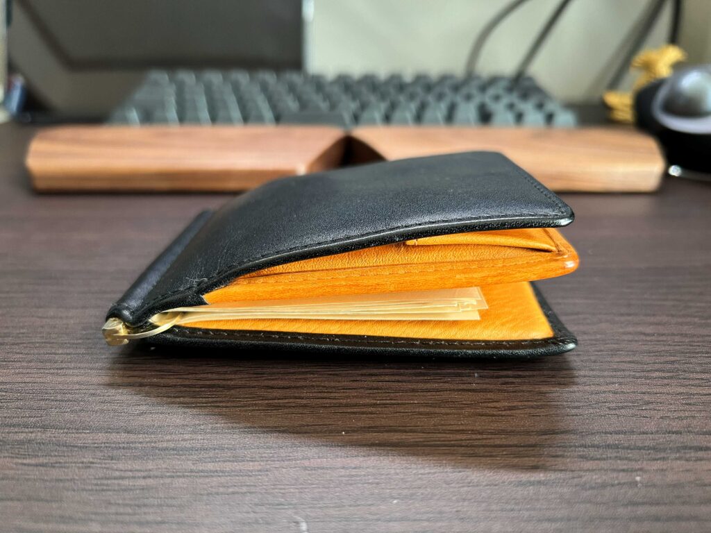 そもそもマネークリップは薄さが命だと思っているから、もっといれるものを選別して薄くなるようにするのが良いだろう。
