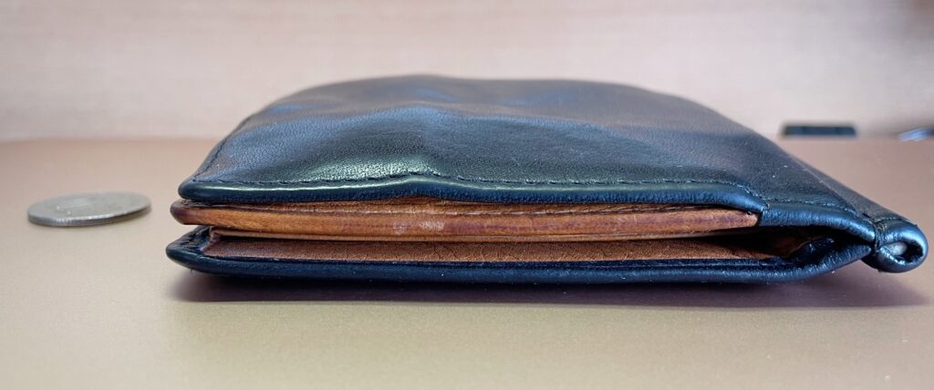 4年使って革が経年劣化でなじんでこの厚さのため、新品購入の場合はかなりぶ厚くなる。