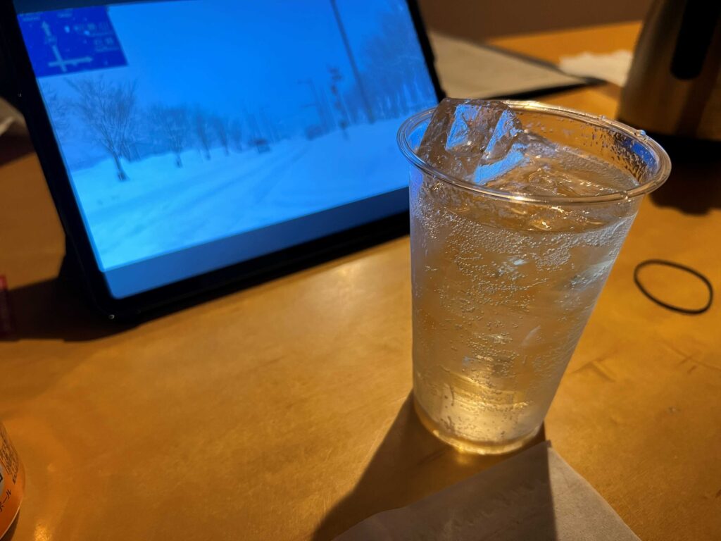 ちょうど部屋の近くに製氷機があったのでハイボール。でかい氷をコップ一杯にして飲むハイボールうますぎ。