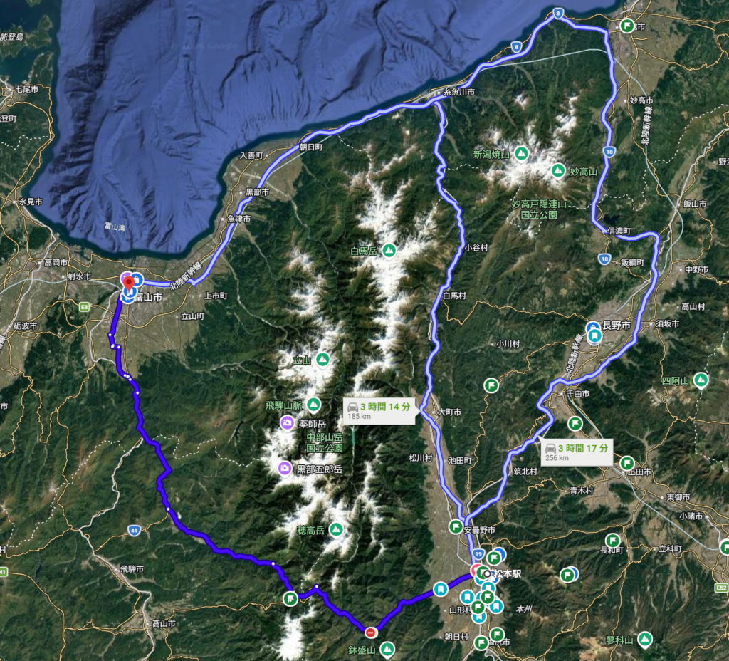 フルで高速を使うというパターンも一応Googleマップは提案してくれているけど、上越と松本間は何度も走っていて飽きたし、日本海側も何度か走ったことがあるためワクワクしない。
