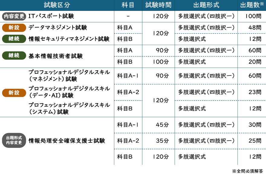 データマネジメント試験(仮称)やプロフェッショナルデジタルスキル試験(仮称)の新設、ITパスポート試験の出題構成の変更などを検討しています。